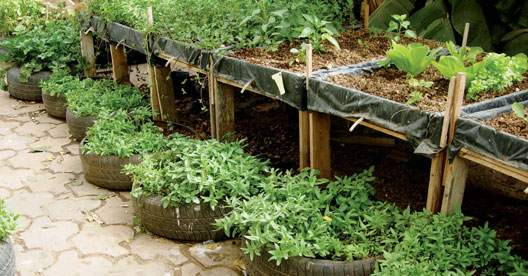 A micro-garden can be grown on an area of just one square metre. Water requirements are modest, an important consideration in developing cities, where good quality water is often scarce and expensive. In a year, a one square metre micro-garden consumes about 1 000 litres of water, or less than 3 litres per day. To ensure a regular water supply, micro-gardeners can channel rainwater into storage via a system of gutters and pipes. Rainwater is virtually free (after the investment in harvesting equipment) and usually of good quality. From a roof of 20 sq m, growers can collect 2 000 litres of water for every 100 mm of rainfall, enough for the year-round cultivation of a micro-garden of two square metres. Keeping micro-gardens productive is also fairly simple. They can be fertilized regularly, at no cost, with compost produced from household organic waste. Pests are controlled by non-chemical means, including coloured sticky traps, insect proof nets and intercropping with aromatic herbs that naturally repel insects, such as basil, parsley and mint